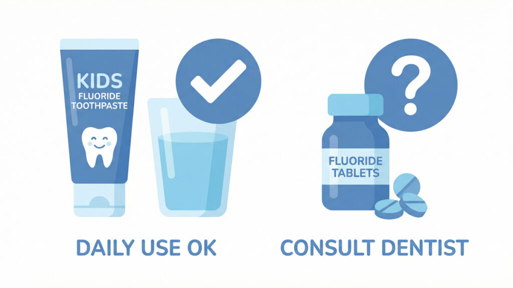 This distinction matters enormously for parents. Fluoride toothpaste works differently from a supplement — it acts topically on the tooth surface rather than being absorbed into the body.